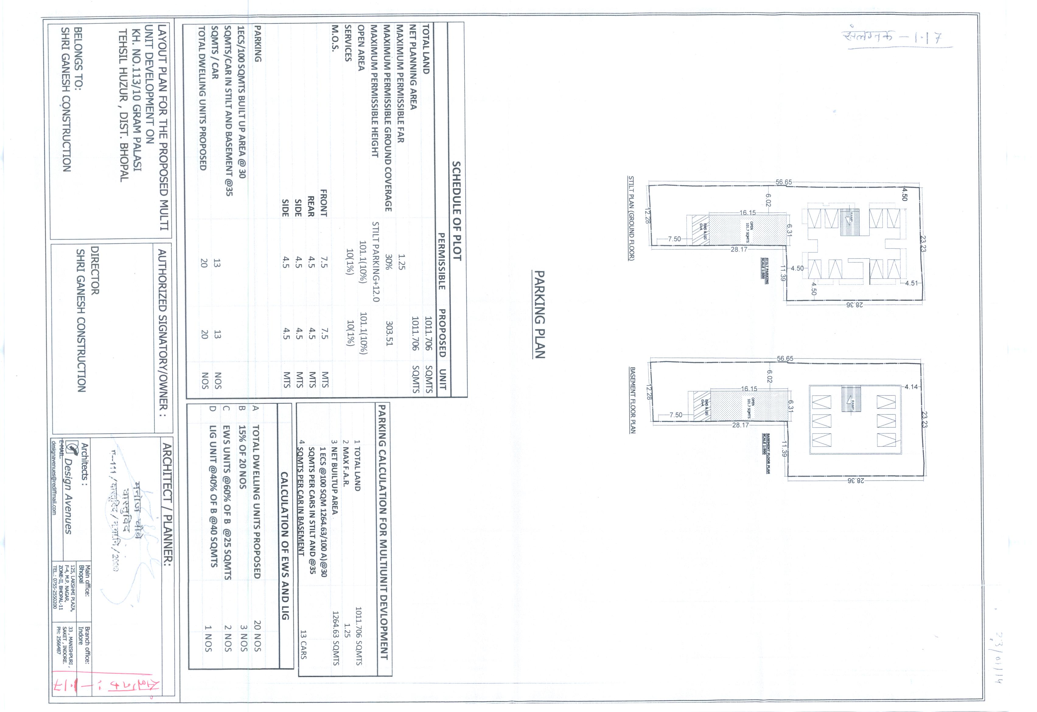 1.16 पार्किग संबंधी गणना तथा पार्किंग दर्शाने वाला अभिन्यास जिसमें गाडि़यों की संख्या स्पष्ट रूप से दर्शाया गया हो ।